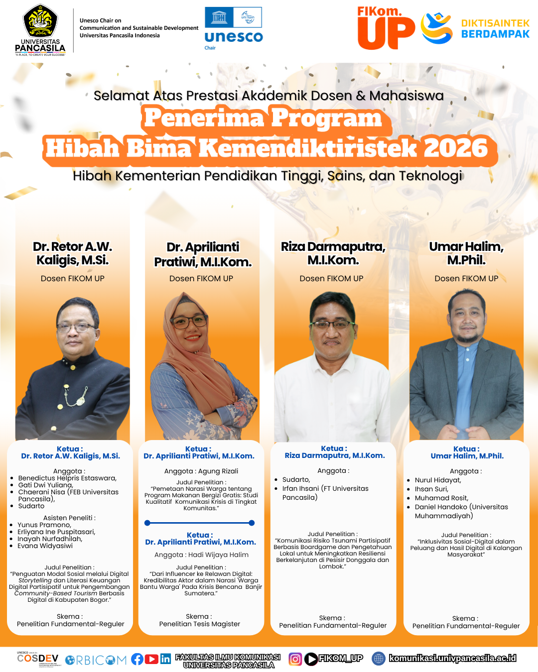 Selamat dan sukses kepada para dosen dan mahasiswa FIKOM Universitas Pancasila yang telah berhasil meraih pendanaan penelitian melalui program Hibah BIMA Kemdiktisaintek tahun 2026. 🎉