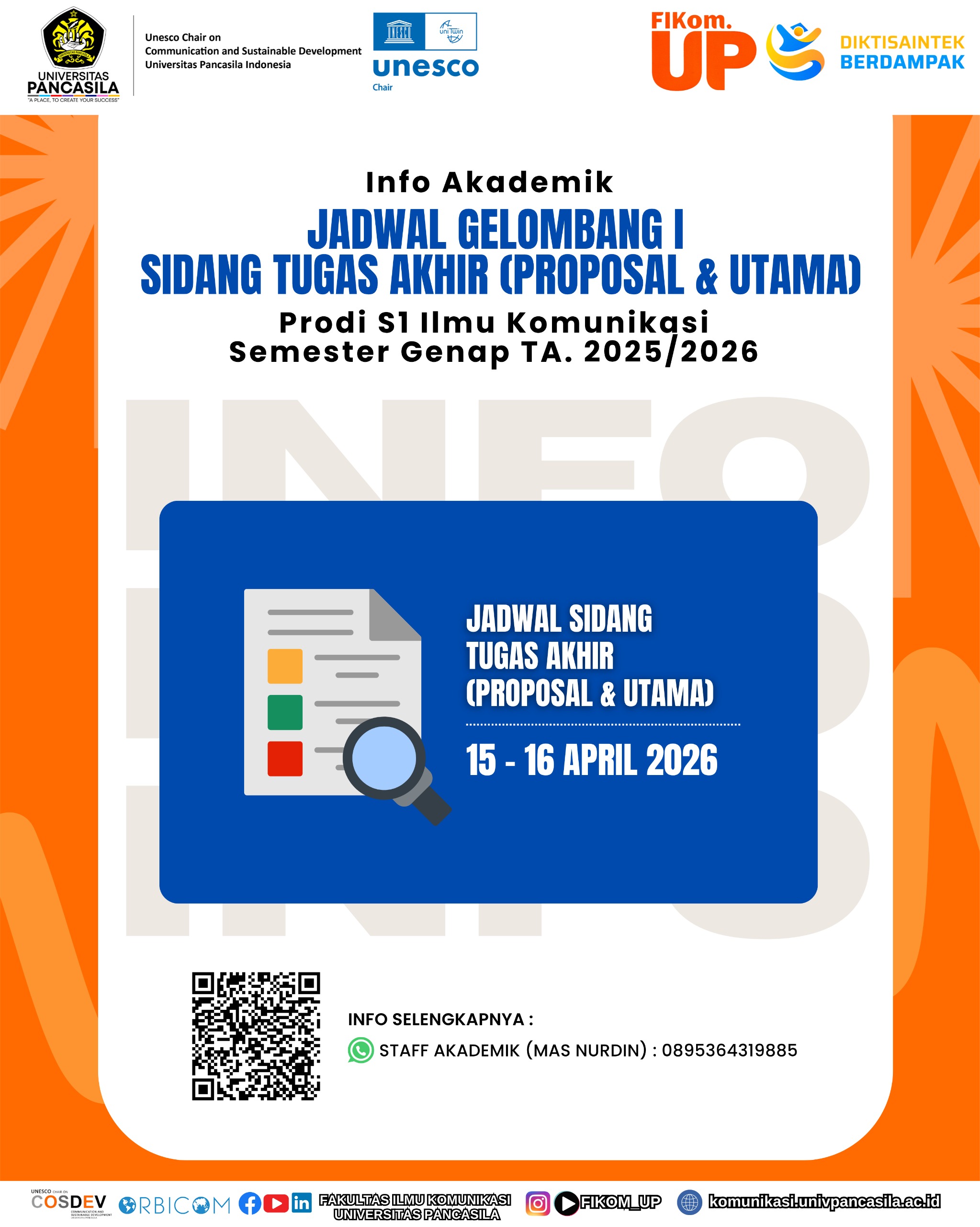 Prodi S1 Ilmu Komunikasi – Semester Genap TA. 2025/2026 Ayo persiapkan diri dengan matang untuk menghadapi Sidang Tugas Akhir (Proposal & Utama). Deg-degan itu wajar,