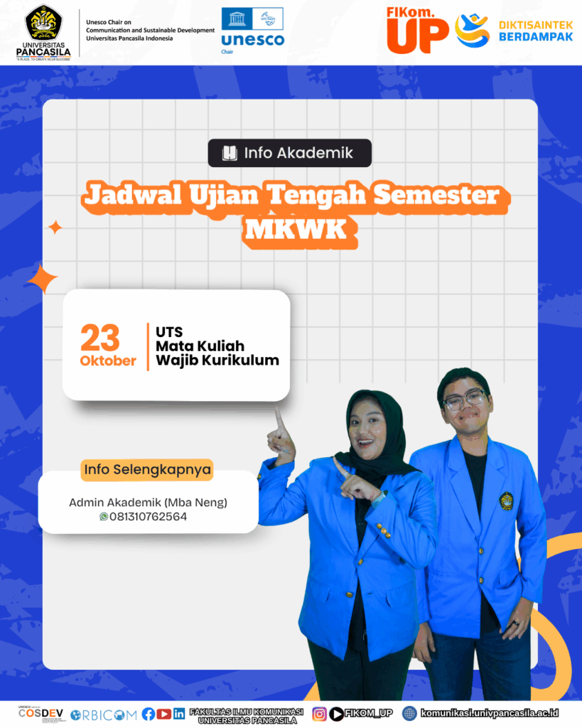 Jangan lupa untuk melaksanakan Ujian Tengah Semester (UTS) MKWK yang meliputi mata kuliah Pancasila, Kewarganegaraan, Agama, dan Bahasa Indonesia. 📍 Pelaksanaan sesuai jadwal masing-masing kelas dan lokasi.Pastikan kamu sudah cek jadwal lengkapnya di Neosiak, ya! Semangat menjalani UTS, semoga hasilnya memuaskan! 💪✨