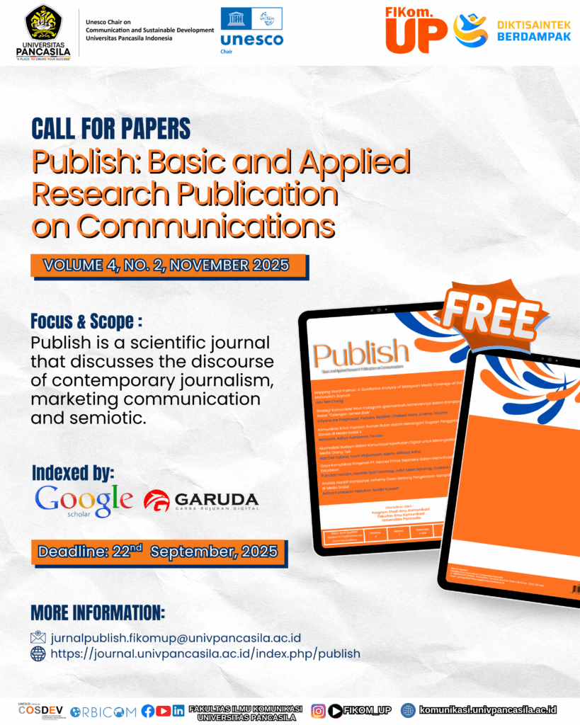 Publish: Basic and Applied Research Publication on Communications adalah jurnal ilmiah yang diterbitkan oleh Fakultas Ilmu Komunikasi Universitas Pancasila, Jakarta. Publish: Basic and Applied Research Publication on Communications terbit sejak tahun 2022, dua kali dalam setahun, pada bulan Mei dan November dimana jurnal kami memuat artikel-artikel dari hasil penelitian berbasis pengetahuan di bidang komunikasi. Naskah […]