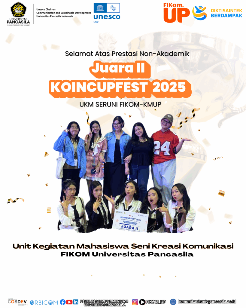 Selamat kepada Unit Kegiatan Mahasiswa Seni Kreasi Komunikasi (UKM SERUNI) meraih juara II di Kejuaraan Korea Indonesia Culture – UP Festival (KOINCUPFEST) 2025 yang dilaksanakan pada tanggal 16-17 September 2025 di Universitas Pancasila. Semoga pencapaian ini dapat memotivasi mahasiswa FIKOM Universitas Pancasila lainnya untuk menjadi semakin terdepan dalam meraih prestasi masing-masing.