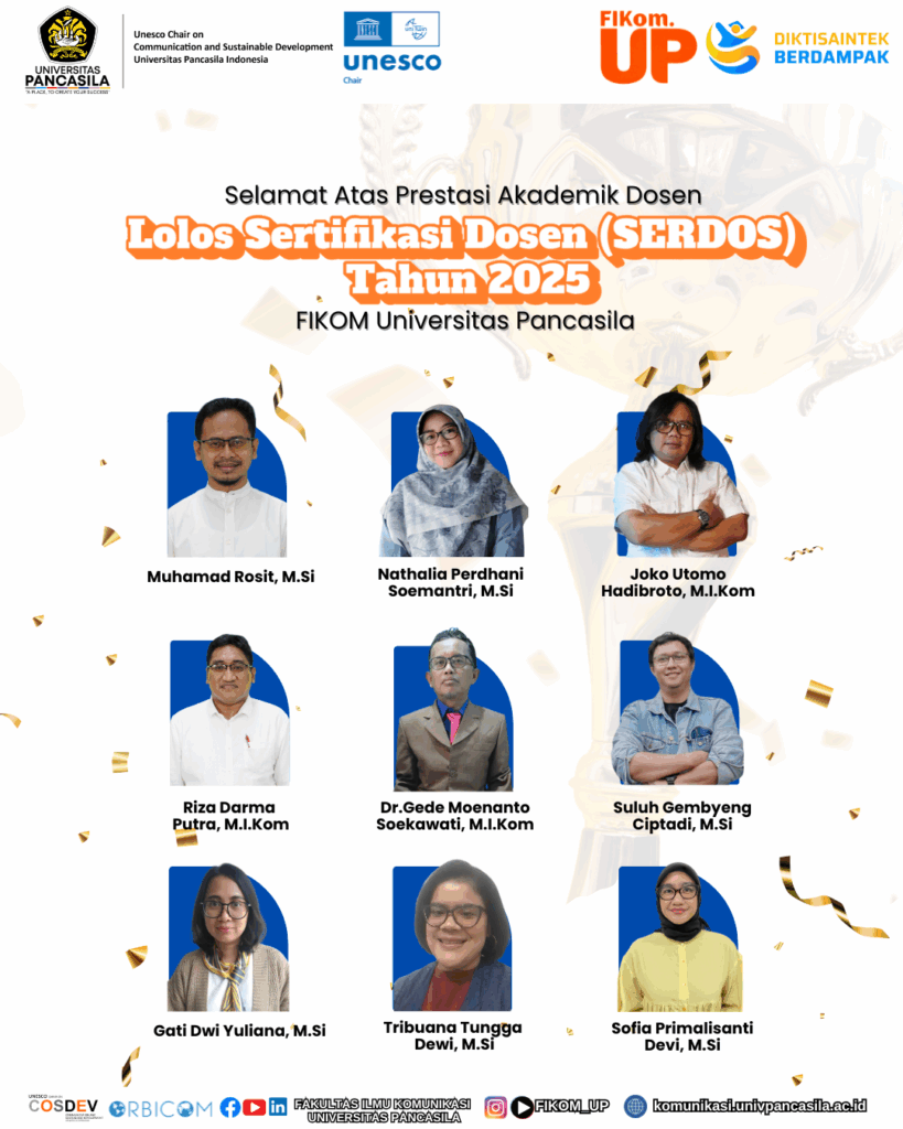 Fakultas Ilmu Komunikasi Universitas Pancasila mengucapkan selamat kepada 9 dosen FIKOM UP yang telah meraih Sertifikasi Dosen (SERDOS) Tahun 2025. Berikut daftar dosen tetap FIKOM UP yang berhasil lolos SERDOS Tahun 2025 : 1️⃣ Muhamad Rosit, M.Si2️⃣ Nathalia Perdhani Soemantri, M.Si3️⃣ Joko Utomo Hadibroto, M.I.Kom4️⃣ Riza Darma Putra, M.I.Kom5️⃣ Dr. Gede Moenanto Soekawati, M.I.Kom6️⃣ Suluh […]