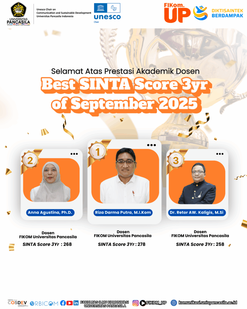 Selamat kepada tiga Dosen Tetap FIKOM UP berhasil meraih peringkat teratas 3 Year SINTA Score periode September 2025 ! Berikut daftar dosen tetap FIKOM UP yang memperoleh penghargaan “Best SINTA Score 3Yr of September 2025” : 1. Riza Darma Putra, M.I.Kom – SINTA Score 3Yr : 2782. Anna Agustina, Ph.D. – SINTA Score 3Yr : […]