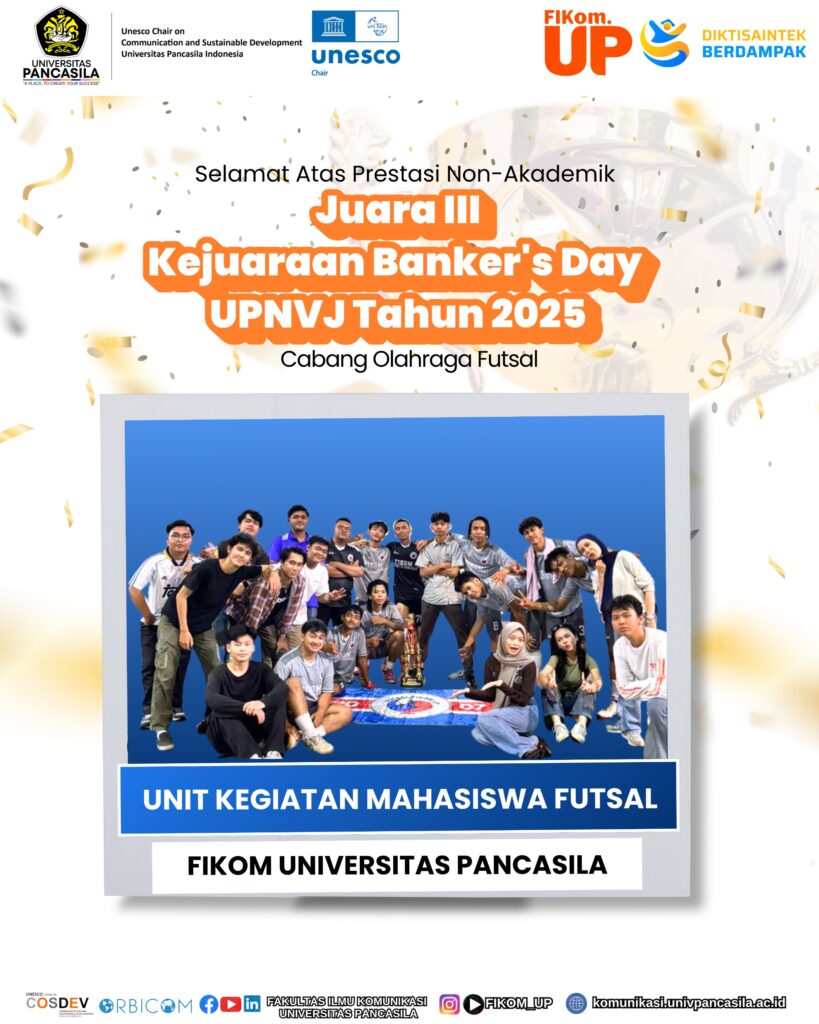 Selamat kepada UKM Futsal FIKOM-KMUP @futsalfikomup meraih juara III di Kejuaraan Kompetisi Banker’s Day UPNVJ Tahun 2025 yang dilaksanakan pada Minggu, 29 November 2025 di UPN Veteran Jakarta. Berikut perwakilan mahasiswa FIKOM UP yang berhasil meraih Juara III di Kejuaraan Kompetisi Banker’s Day UPNVJ Tahun 2025 : 1. Zaky Muhammad Fauzan Asyamsudin (7024210194) @zakyfauzann_2. Brayen […]