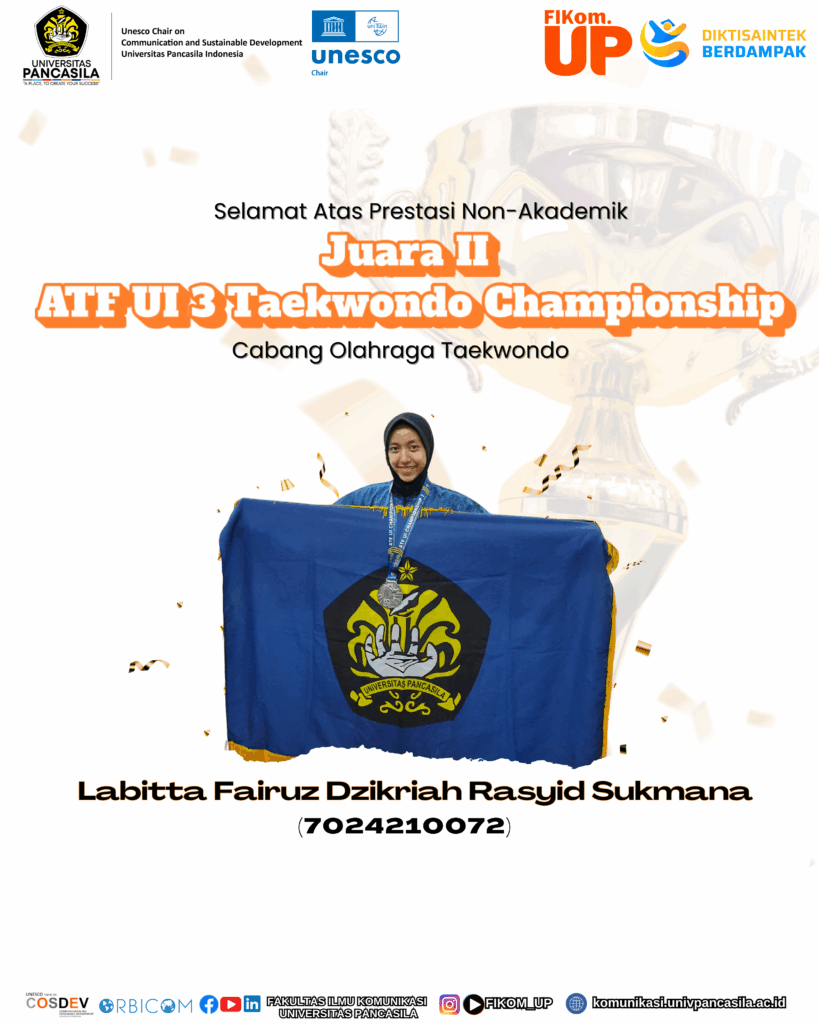 Selamat kepada Labitta Fairuz Dzikriah Rasyid Sukmana @labittars (7024210072) meraih Juara II di Kejuaraan ATF UI 3 Taekwondo Championship yang diselenggarakan pada tanggal 25-27 Juli di Balaiurung Universitas Indonesia, Jawa Barat. Semoga pencapaian ini dapat memotivasi bagi mahasiswa FIKOM UP menjadi semakin terdepan dalam meraih prestasi masing-masing.