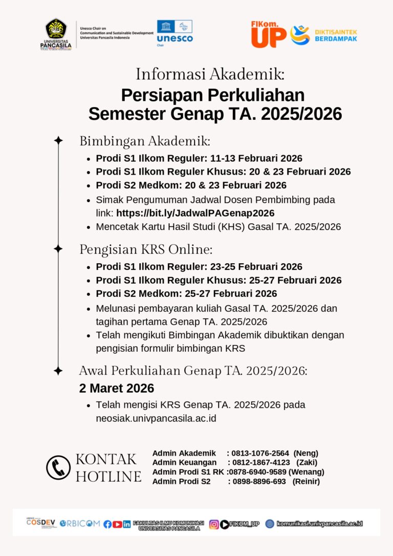 Berikut kami sampaikan pembaruan informasi mengenai rangkaian agenda akademik yang perlu diperhatikan oleh seluruh mahasiswa. Jika membutuhkan informasi lebih lanjut, silakan menghubungi Admin Akademik dan Prodi melalui kontak yang tersedia😊