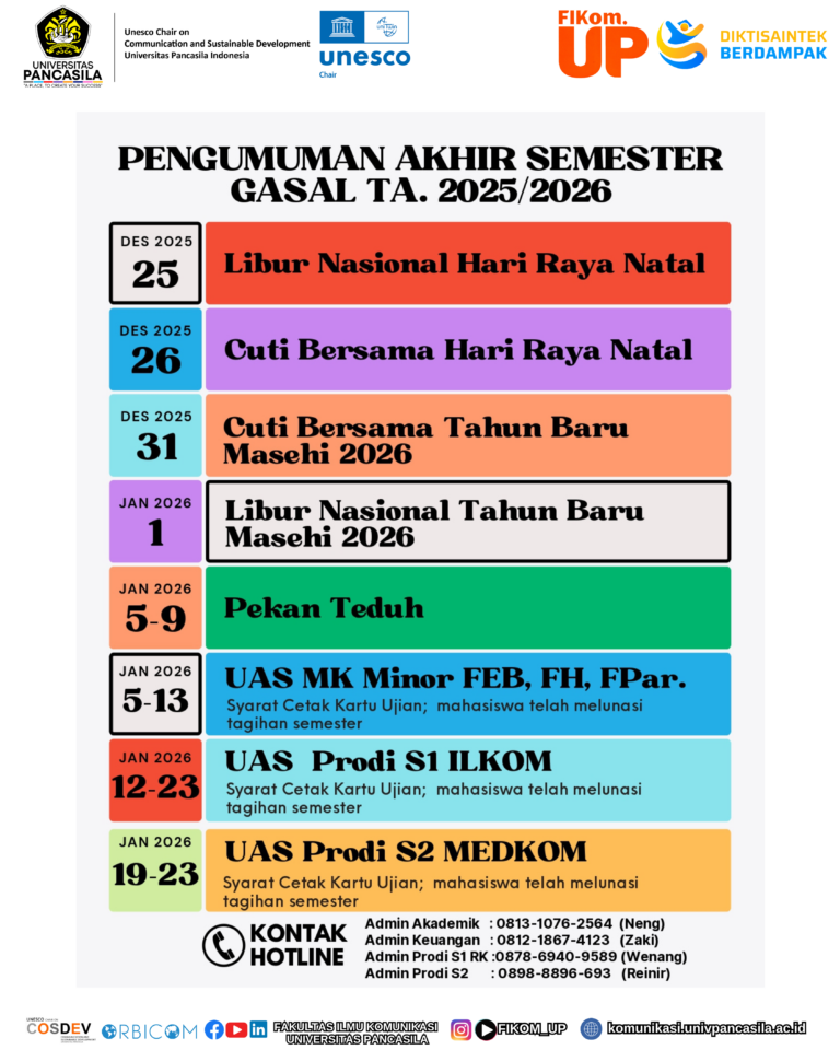 Silakan cek informasi lengkap mengenai jadwal kegiatan akademik Semester Gasal Tahun Akademik 2025/2026 melalui kanal resmi Fakultas Ilmu Komunikasi Universitas Pancasila.Â