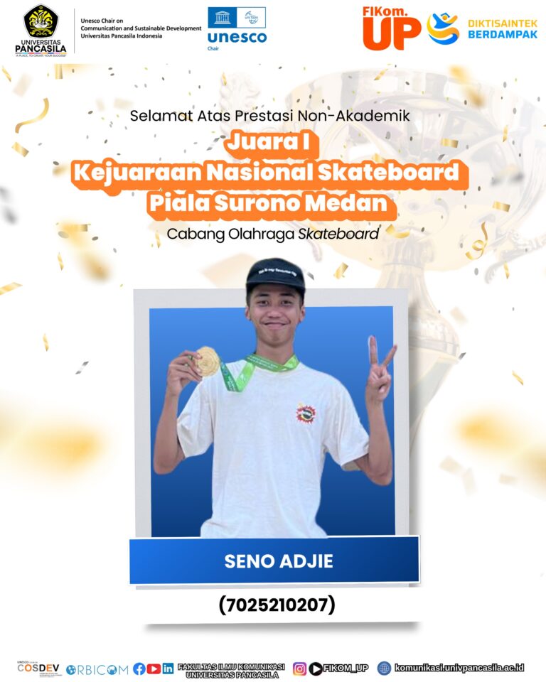 Selamat kepada Seno Adjie (7025210207) @zulfi4lfiki meraih Juara I di Kejuaraan Nasional Skateboard Piala Surono Medan diselenggarakan pada tanggal 3-5 Desember 2025 di Arena Sepatu Roda Komplek Sport Center Dispora, Sumater Utara.